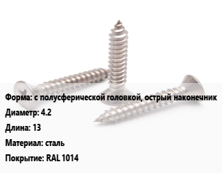 Саморез с полусферической головкой, острый наконечник D=4.2 L=13 сталь RAL 1014