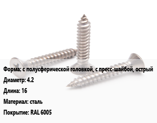 Саморез с полусферической головкой, с пресс-шайбой, острый D=4.2 L=16 сталь RAL 6005