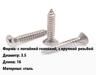 Саморез с потайной головкой, с крупной резьбой D=3.5 L=16 сталь
