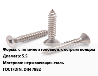 Саморез с потайной головкой, с острым концом D=5.5 нержавеющая сталь ГОСТ: DIN 7982