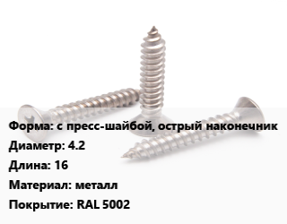 Саморез с пресс-шайбой, острый наконечник D=4.2 L=16 металл RAL 5002