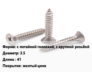 Саморез с потайной головкой, с крупной резьбой D=3.5 L=41 желтый цинк