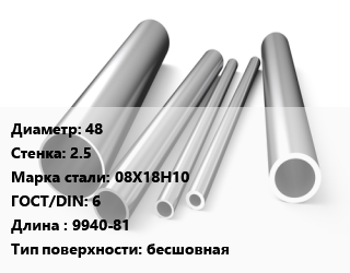 Труба нержавеющая 48х2.5 мм Сталь 08Х18Н10 ГОСТ: 6 L=9940-81 бесшовная