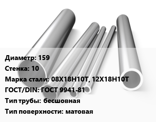 Труба нержавеющая 159х10 мм Сталь 08Х18Н10Т, 12Х18Н10Т ГОСТ: ГОСТ 9941-81 бесшовная матовая