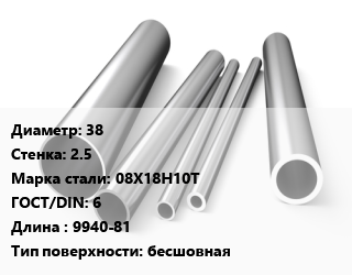 Труба нержавеющая 38х2.5 мм Сталь 08Х18Н10Т ГОСТ: 6 L=9940-81 бесшовная